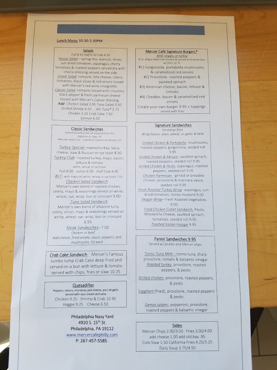 Their Lunch Combo Meals provide excellent value, such as the Grilled Cheese & Soup Combo Lunch or the Pizza & Salad Combo Lunch. If you're craving something more substantial, choose from their variety of Lunch Quesadillas or Mercer Signature Burgers, like the #1 Burger Lunch or the classic Burger Lunch.